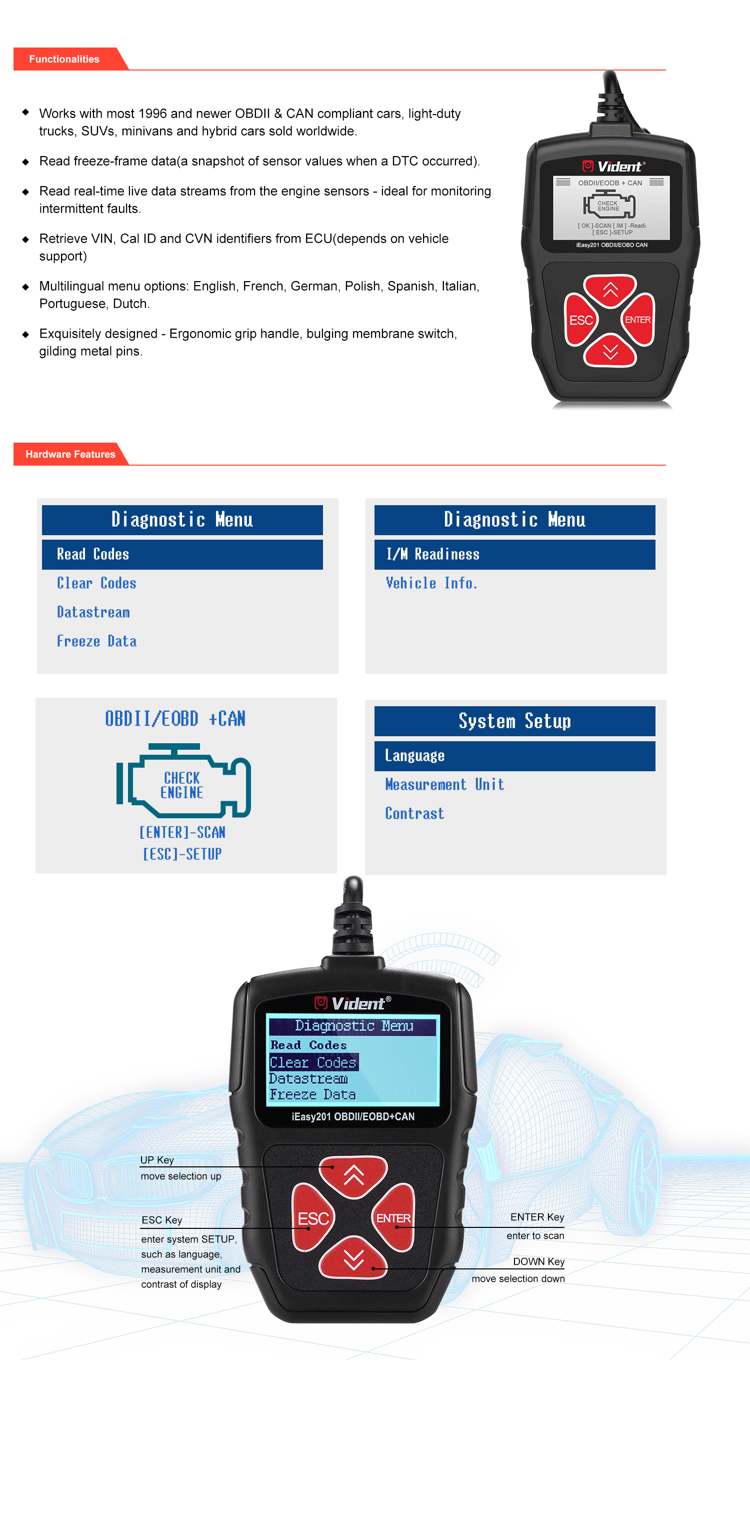 Зчитувач кодів iEasy201 CAN OBDII/EOBD — це міцний та непортативний зчитувач кодів для кожного власника автомобіля. iEasy201 дозволяє користувачам швидко зчитувати та усувати несправності вдома за низькою ціною, це необхідний інструмент для кожного власника автомобіля, щоб знімати всі коди несправностей OBDII.