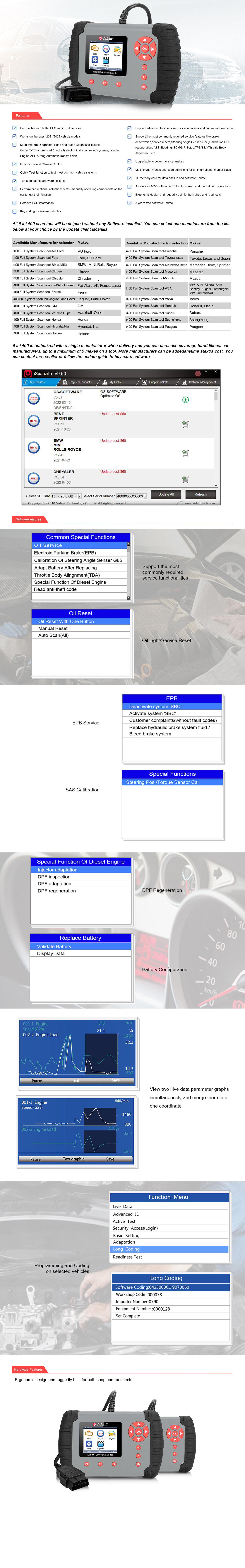 iLink400Full System Single Make Scan tool is the most cost-effective professional multi-system scan tool that delivers OE-level diagnosis for all electronic systems of different car brands.It does not only include basic functions such as read/erase codes and live data, but also it's capable of advanced functions such as actuation, adaptation and programming. In addition, it lets you to access the most commonly required service features such as Oil service Light Reset, Throttle Body Alignment, Electronic Parking Brake Service, Battery configuration, Steering Angel Sensor Calibration, CBS correctand much more.