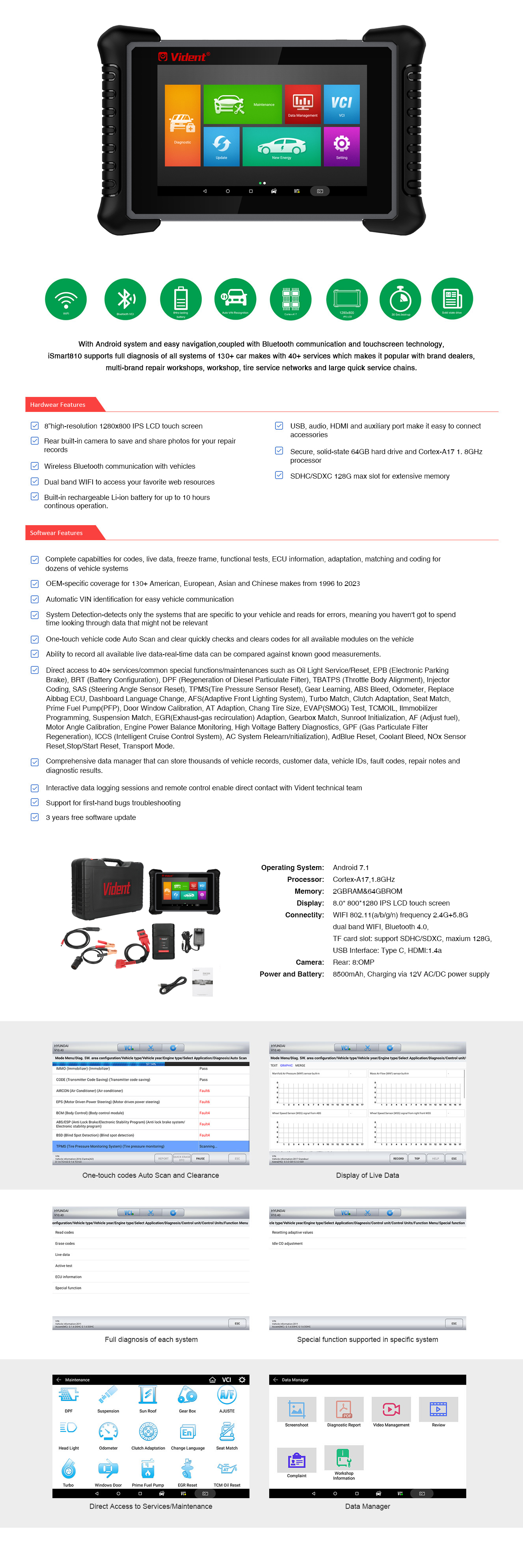Завдяки зручному інтерфейсу Android, твердотільному жорсткому диску на 64 ГБ, процесору Cortex-A7 з тактовою частотою 1,8 ГГц та легкій навігації, а також зв'язку Bluetooth, 8-дюймовому сенсорному IPS LCD-екрану з високою роздільною здатністю 1280x800, iSmart810 підтримує повну діагностику всіх систем понад 100 марок автомобілів з понад 40 послугами, що робить його популярним серед дилерів брендів, багатобрендових ремонтних майстерень, СТО, мереж шиномонтажних робіт та великих мереж швидкого обслуговування.
