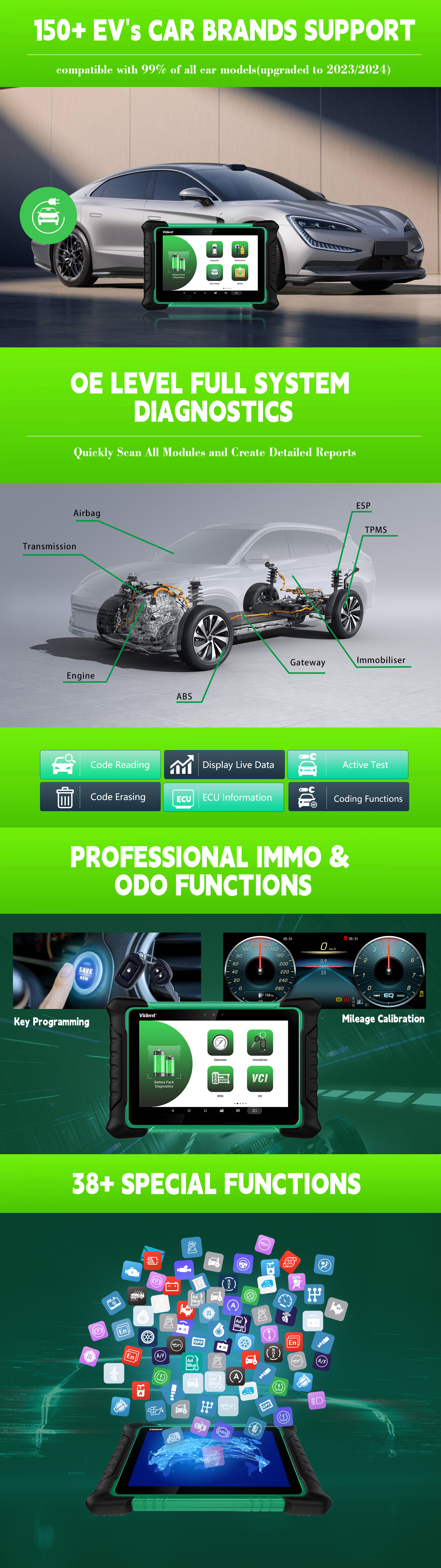 iSmart920 EV – це професійний інтелектуальний діагностичний сканер для електромобілів з 10,1-дюймовим високопродуктивним планшетом на базі Android. iSmart920 EV підтримує діагностику більшості брендів електромобілів, діагностичне програмне забезпечення та операційна система підтримують онлайн-оновлення. iSmart920 EV охоплює виявлення акумуляторних батарей для більшості електромобілів, а також підтримує традиційну діагностику бензинових та дизельних легкових автомобілів. Крім того, він також охоплює професійні функції IMMO та ODO, понад 40 спеціальних функцій. iSmart920 EV – найкращий сканер 4 в 1 на ринку.