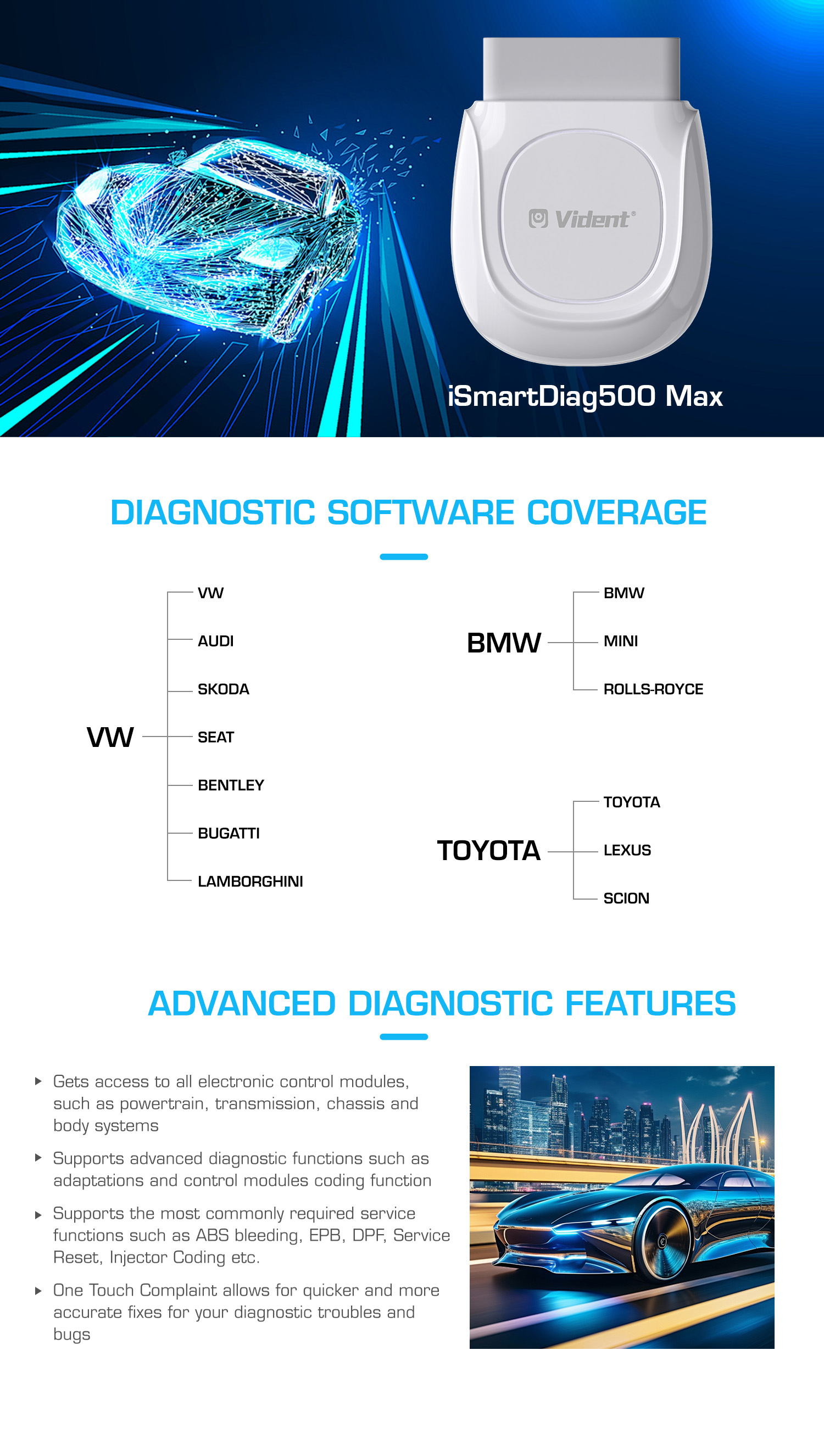 iSmartDiag500Max підтримує вибір брендів автомобілів груп VW, BMW та TOYOTA, що пропонує діагностику рівня оригінального обладнання для всіх електронних систем керування. Він охоплює не лише основні діагностичні функції, такі як зчитування/стирання кодів несправностей, дані в реальному часі, активне тестування, але й здатний виконувати розширені функції, такі як автономне кодування та адаптація. Крім того, він забезпечує деякі поширені сервісні функції, такі як скидання індикатора рівня оливи, кодування форсунок, обслуговування електронного стоянкового гальма, конфігурація акумулятора, калібрування датчика кута повороту керма, DPF тощо.