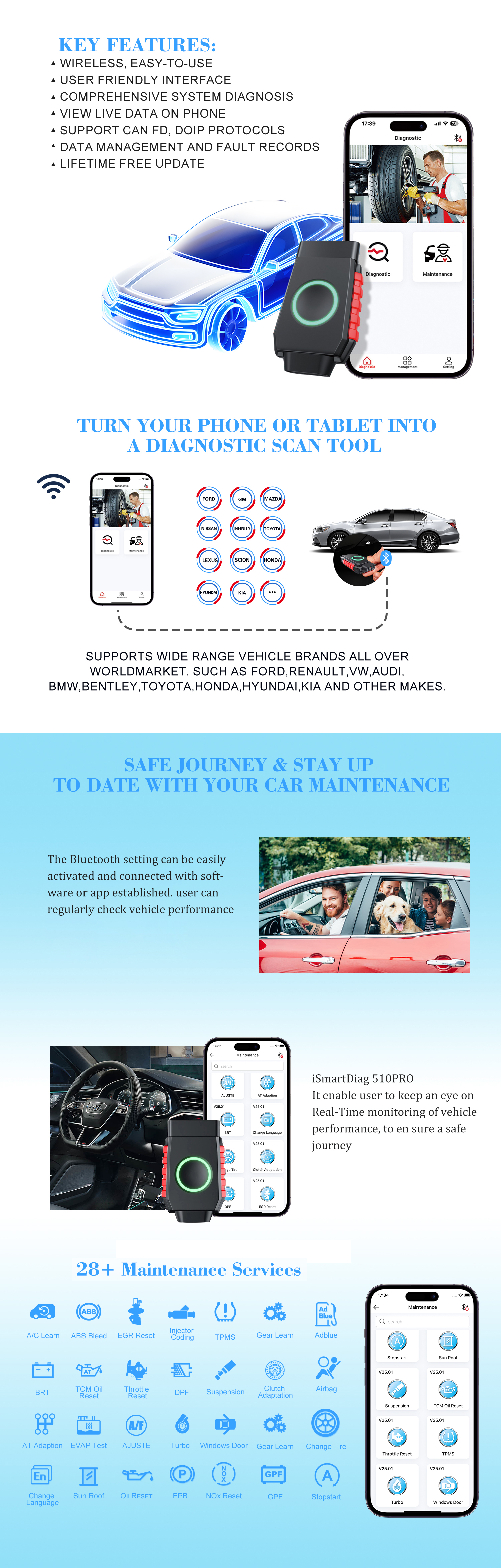 iSmartDiag510 Pro is a newly released bluetooth diagnostic dongle, which can free user from the hassle of cables. It supports iOS and Android operating system, with iSmartDiag510 Pro, user can access to ECU data easily. The iSmartDiag510 Pro supports 28+ special functions like service reset, ABS bleeding, EPB, DPF, Injector Coding, Battery Reset, SAS etc.The iSmartDiag510 Pro is particularly helpful for users who want to regularly check vehicle conditions, and like to keep an eye on real-time performance.